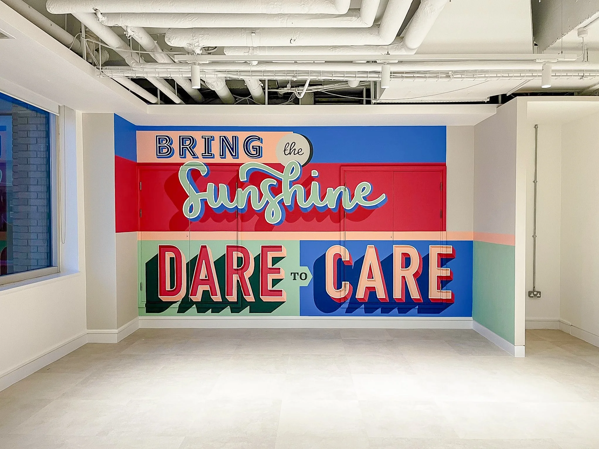 We were asked by Haven to paint 4 murals showcasing their brand values, in the newly renovated social space, inside of their head office. We designed these typographic murals using a few different hand drawn styles, using shadows to make the type as three dimensional as possible. Having the different blocks as background colours, allowed us to be more playful with colours and style within each word.